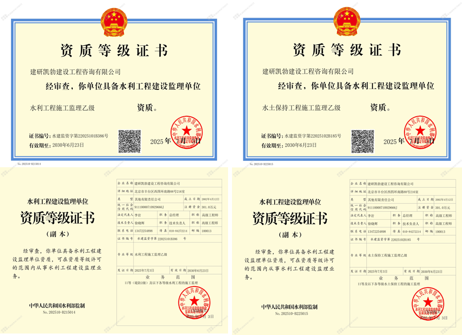 2025年7月3日,建研凯勃公司成功取得中华人民共和国水利部颁发的“水利工程施工监理乙级”和“水土保持工程施工监理乙级”两项资质。这一喜讯标志着公司突破了业务承揽瓶颈,在水利工程施工监理领域迈出了坚实的一步,在资质资信建设上取得的又一重大突破。